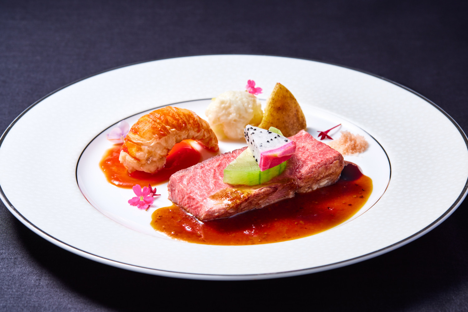 統括総料理長厳選の沖縄県産の黒毛和牛とイセエビを250度の高温で一気に焼き上げ、仕上げのフランベで芳醇な香りを追加。うまみをぎゅっと閉じ込めた柔らかなステーキとプリプリのイセエビに県産のヘチマとドラゴンフルーツを添え、彩り豊かな一皿です。