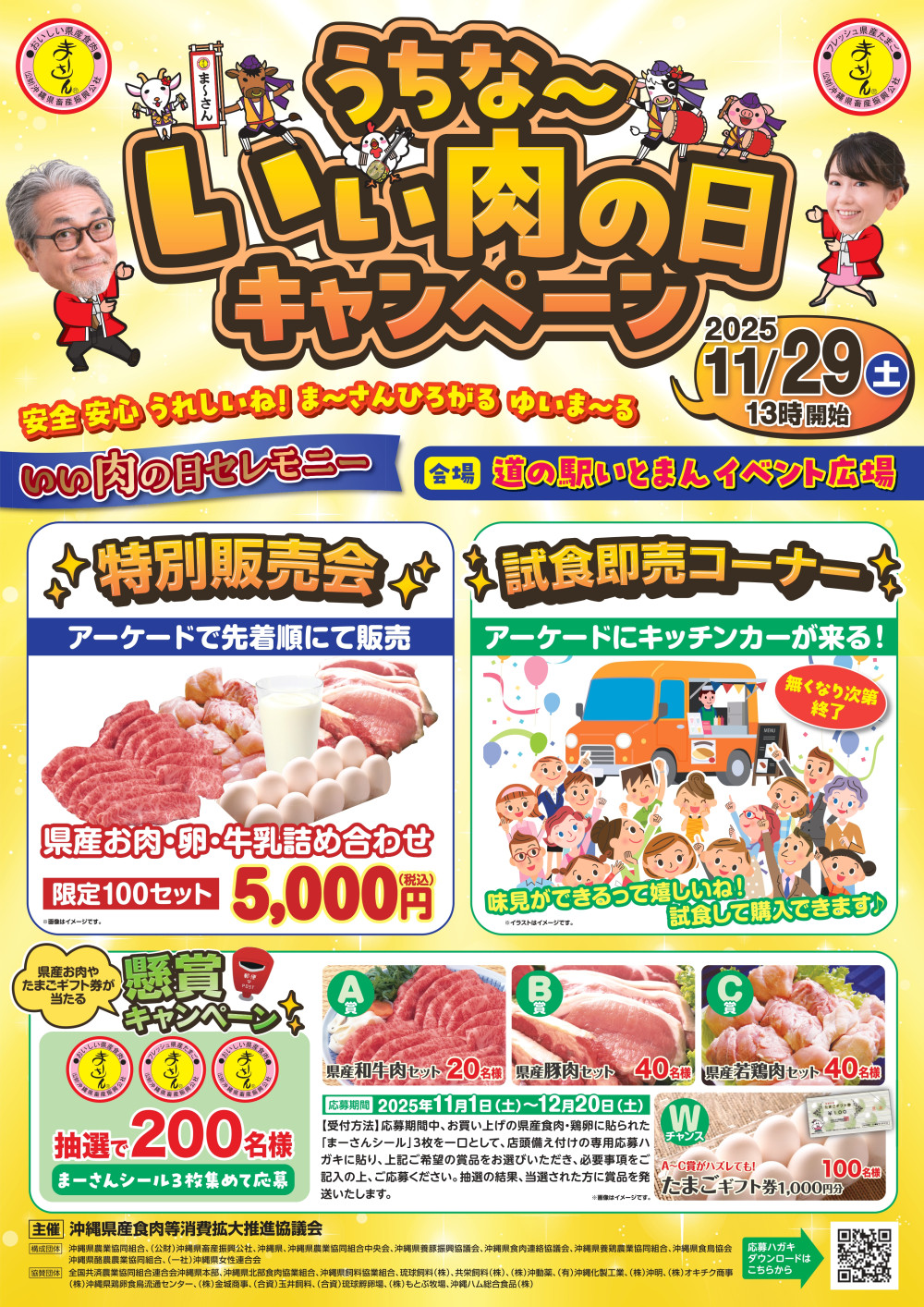 キャンペーンでは、沖縄県産のお肉や卵に貼られた「ま~さんシール」を集めて応募すると、県産和牛などがあたる「懸賞キャンペーン」の他、沖縄県産のお肉や卵、牛乳がセットになったお得な詰め合わせセット(100セット限定)が販売される”特別販売会”や試食してすぐに購入ができる”試食即売コーナー”などを楽しめる「いい肉の日セレモニー」が開催されます!