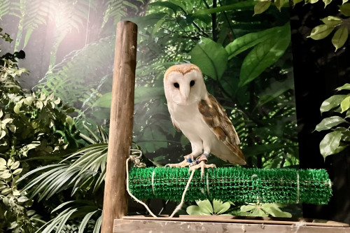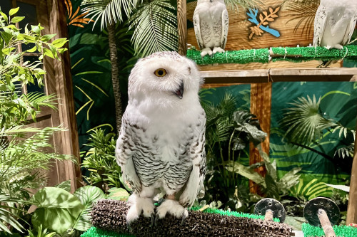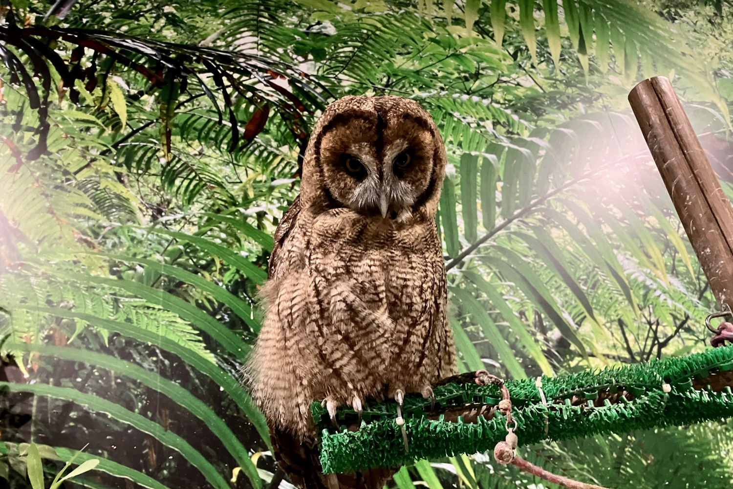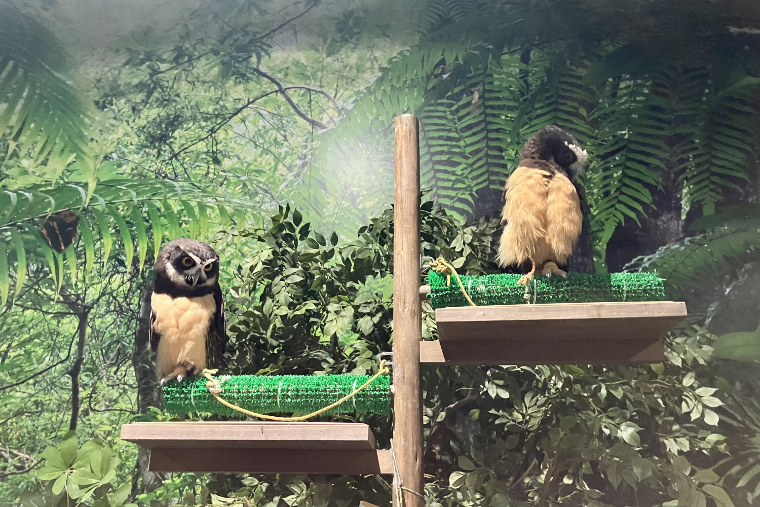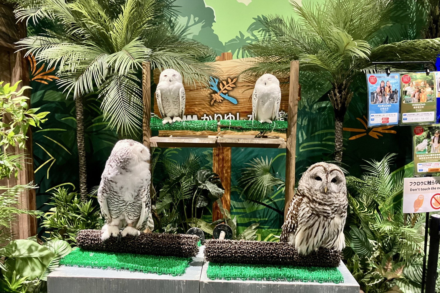 『カフーの森』は沖縄のやんばるの森をイメージしたエリアで、丸くもふもふしたかわいらしいシルエットのフクロウや、大きな翼を持つクールなフクロウたちを間近で観察することができます。