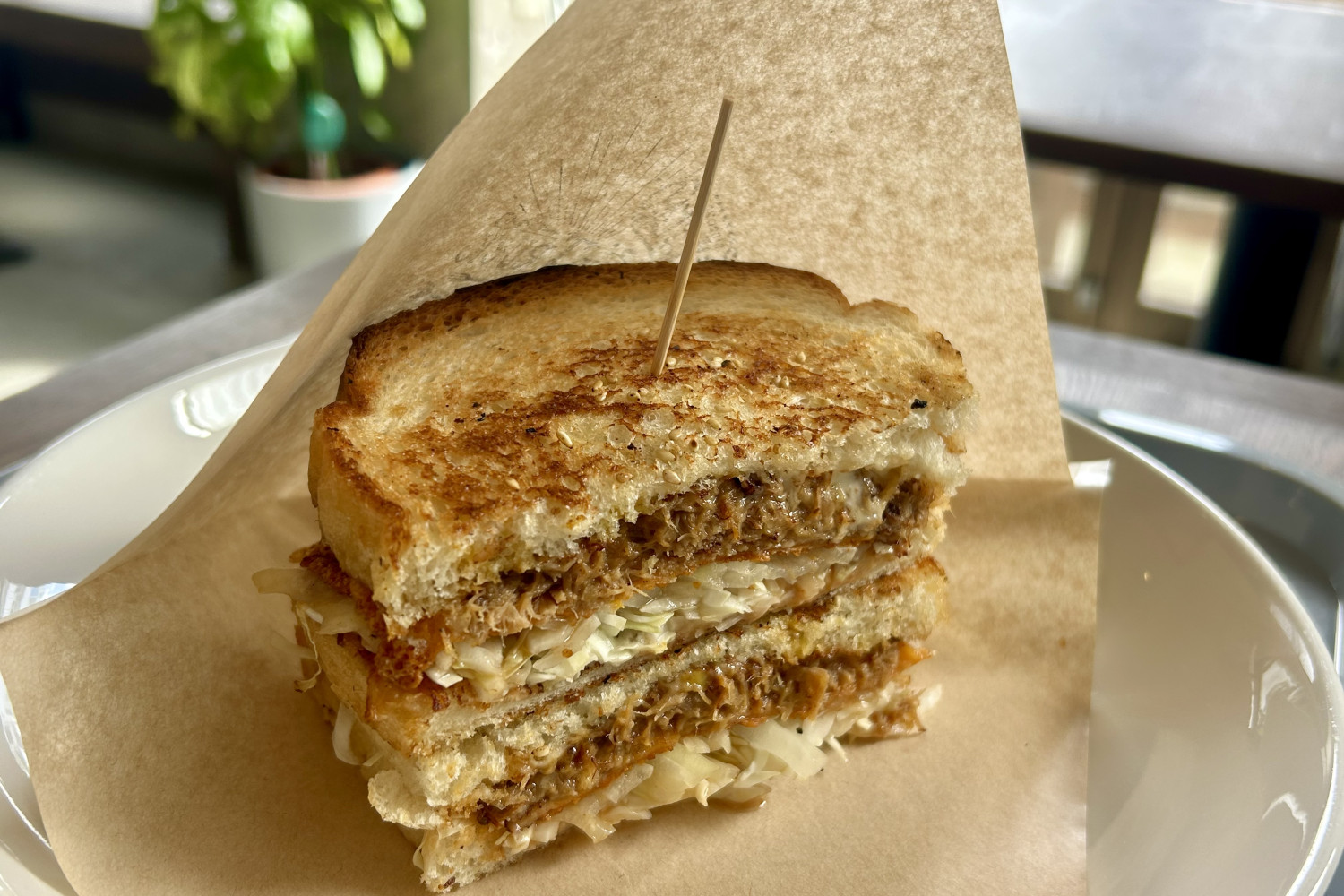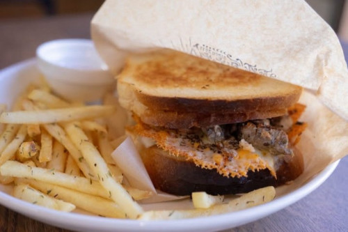 人気メニューは「オレンジプルドポークのグリルドチーズサンド」と「ハーブチキンのグリルドチーズサンド」。自家製の食パンはシンプルな味付けながら香ばしく、具材の旨味を引き立てます。ほかにも、ポークやチキンを使ったライスプレート、ブリュレフレンチトーストなどのメニューがあります。