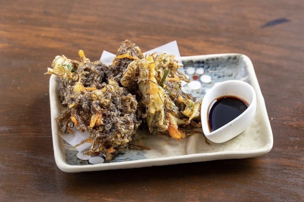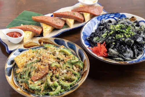 ゴーヤチャンプルーやイカスミ焼きそば、もずくの天ぷらなど、地元食材を使った沖縄料理や居酒屋メニューが豊富です。