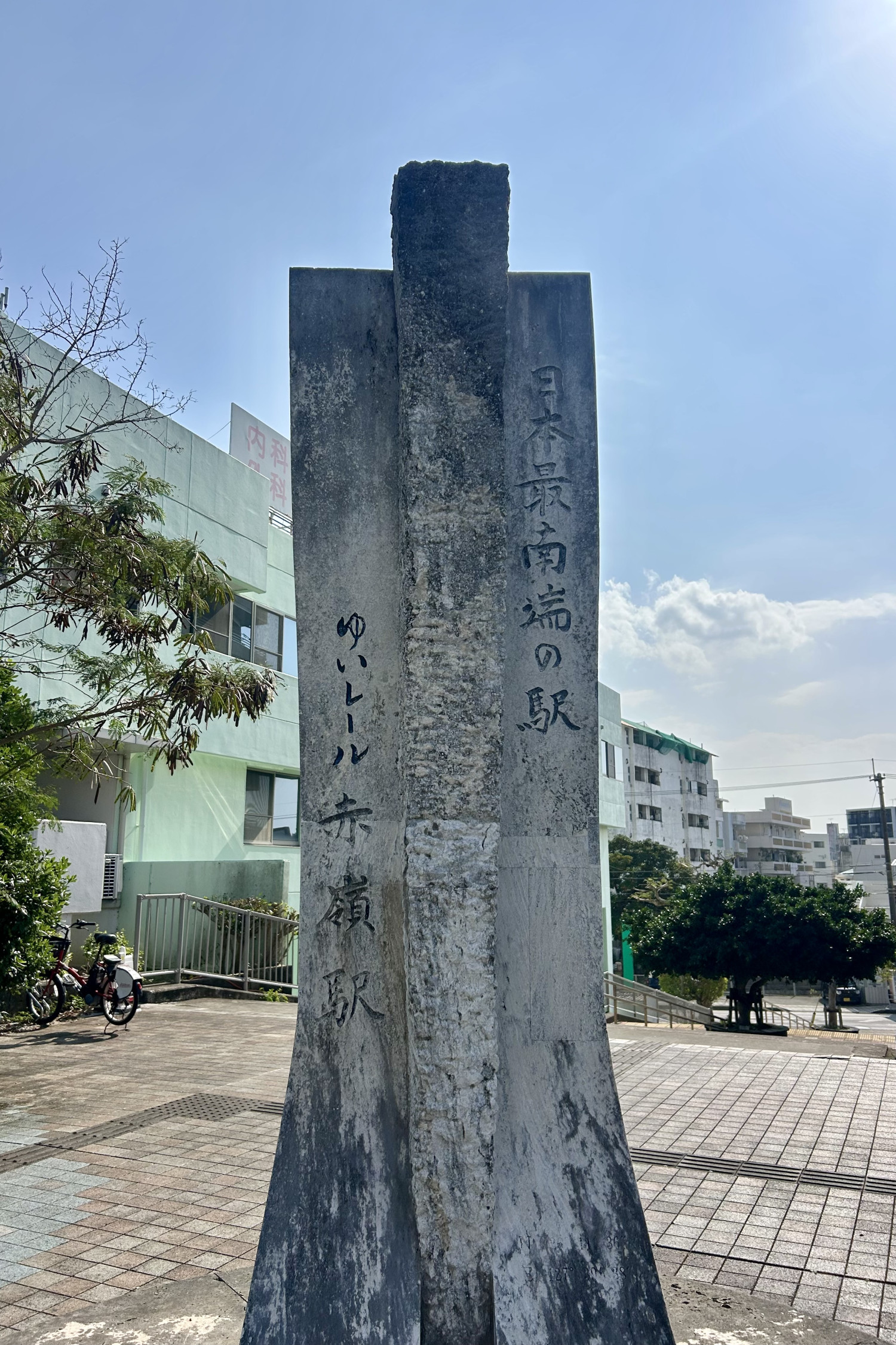 駅に隣接する交通広場には、本島南部の主要観光スポットにアクセスできる路線バス乗り場や自転車が借りられるスポットがあります。軌道系交通の駅としては日本最南端の駅であることから、記念碑も設置されています。