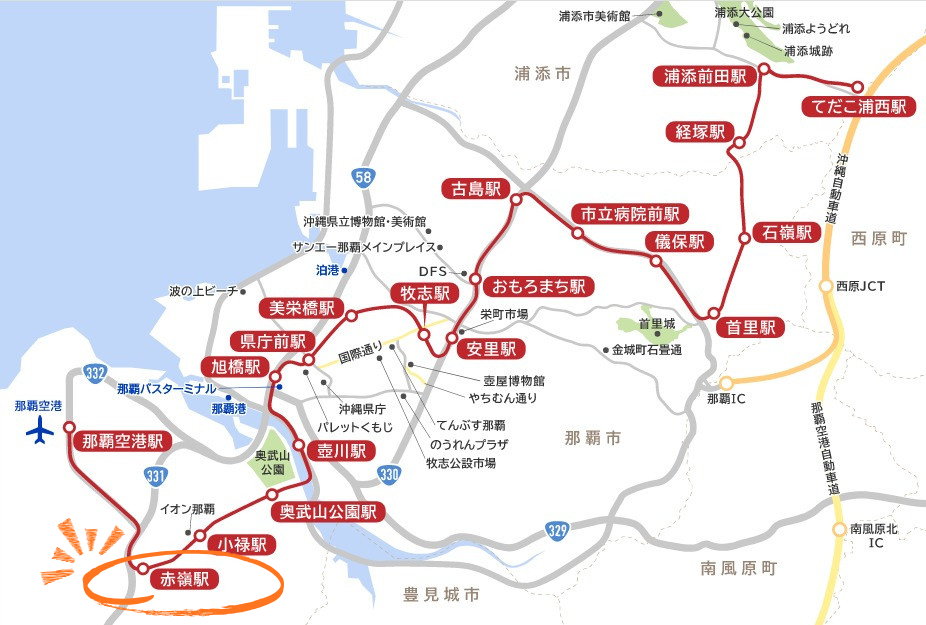 赤嶺駅は、那覇空港からわずか一駅という利便性の高いロケーションにあり、南部エリアへの玄関口として機能しています。駅に到着する際に両側に広がる自衛隊基地を眺めながら進むため、開放的な風景も特徴的です。糸満市や豊見城市などの南部エリアへのアクセスが良好で、路線バスやタクシー、自家用車とのスムーズな乗り継ぎができるよう交通広場も整備されています。