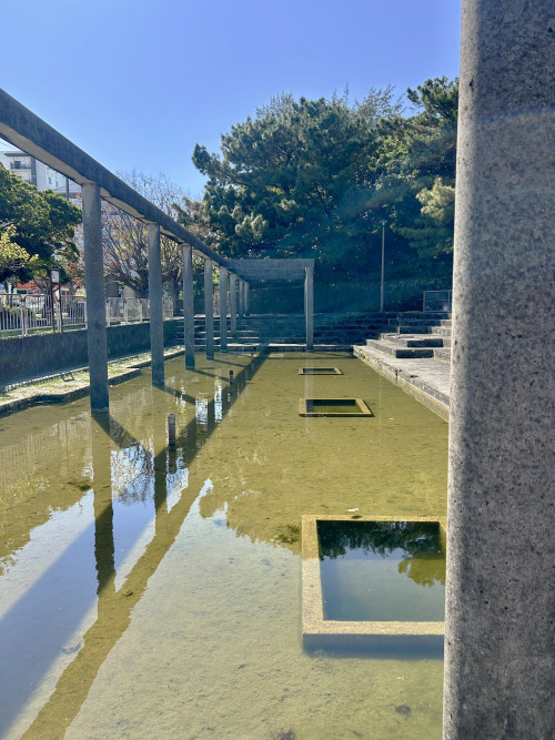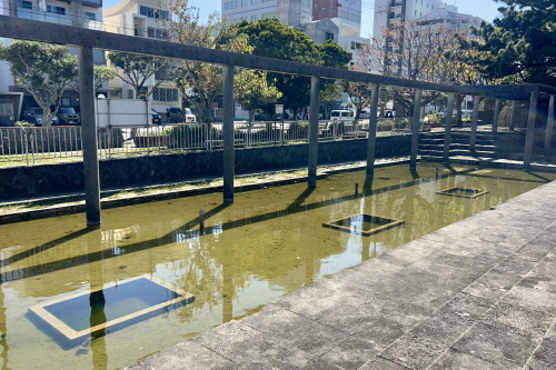 広々とした敷地を水路が囲む、静かで落ち着いた雰囲気の場所です。ベンチに腰掛けて水面を眺めていると、心ほどけるひとときを過ごせます。