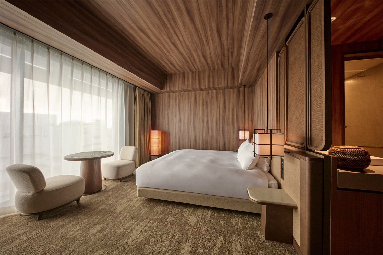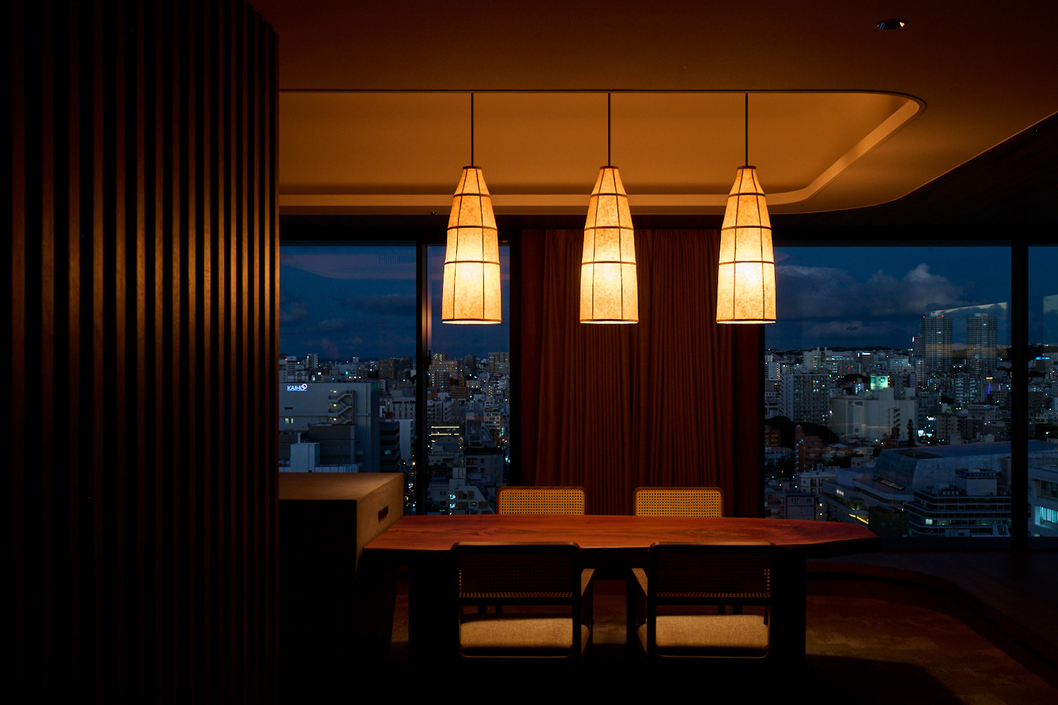 内でも外でもない、琉球特有の雨端(あまはじ、雨や日光を遮る深く張り出した庇とその下の空間)の心地よさを表現した客室。クバの葉を使ったテーブルや芭蕉紙のフロアランプが島の穏やかな時間を感じさせます。