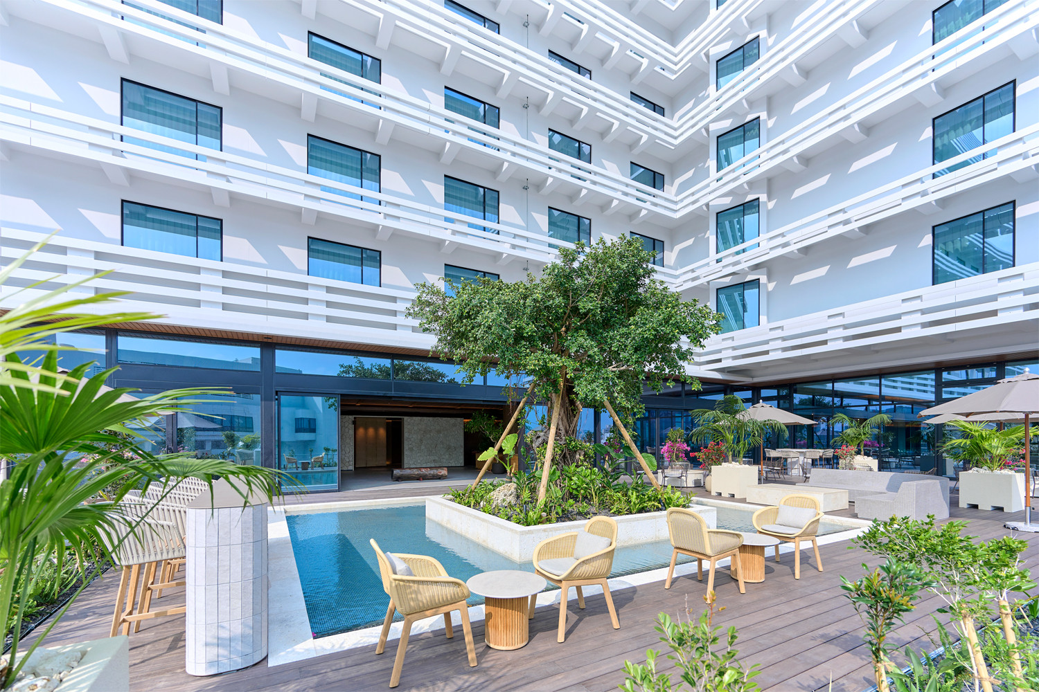 7Fでゲストを迎えるのは芭蕉布のスクリーンと、その先に見える琉球アカギのベンチとシンボルツリーのガジュマル。ロビーにはこの地に自生する植物が配され、琉球石灰岩の壁やカウンターなど、珊瑚の大地が育んだ自然のエネルギーを感じられます。大きな窓からつながるテラスは、ガジュマルを囲んで水盤が施され、せせらぎや風を感じながら琉球の自然の開放感とやさしさに包まれる空間です。