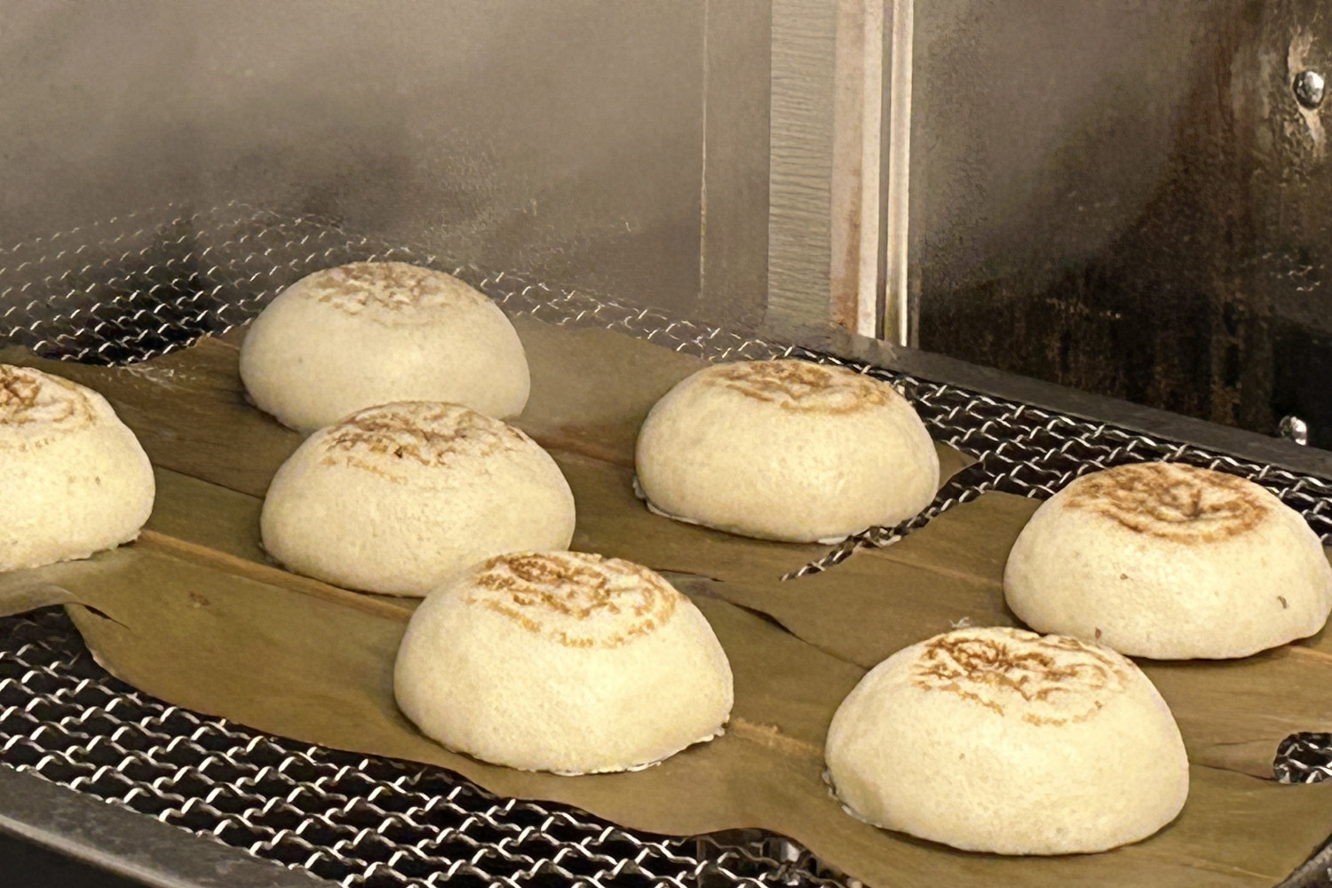 お店の名物は、やさしい甘さのあんこを、泡盛を練り込んだふわふわの生地で包んだ「首里まんじゅう」。2代目店主の仲村盛賢さんが2003年のゆいレール開通を記念して考案し、「第26回全国菓子大博覧会」で最高賞の名誉総裁賞(芸術部門)を受賞した一品です。月桃の葉にのせて蒸されており、口に運ぶとふわりと香りが広がります。