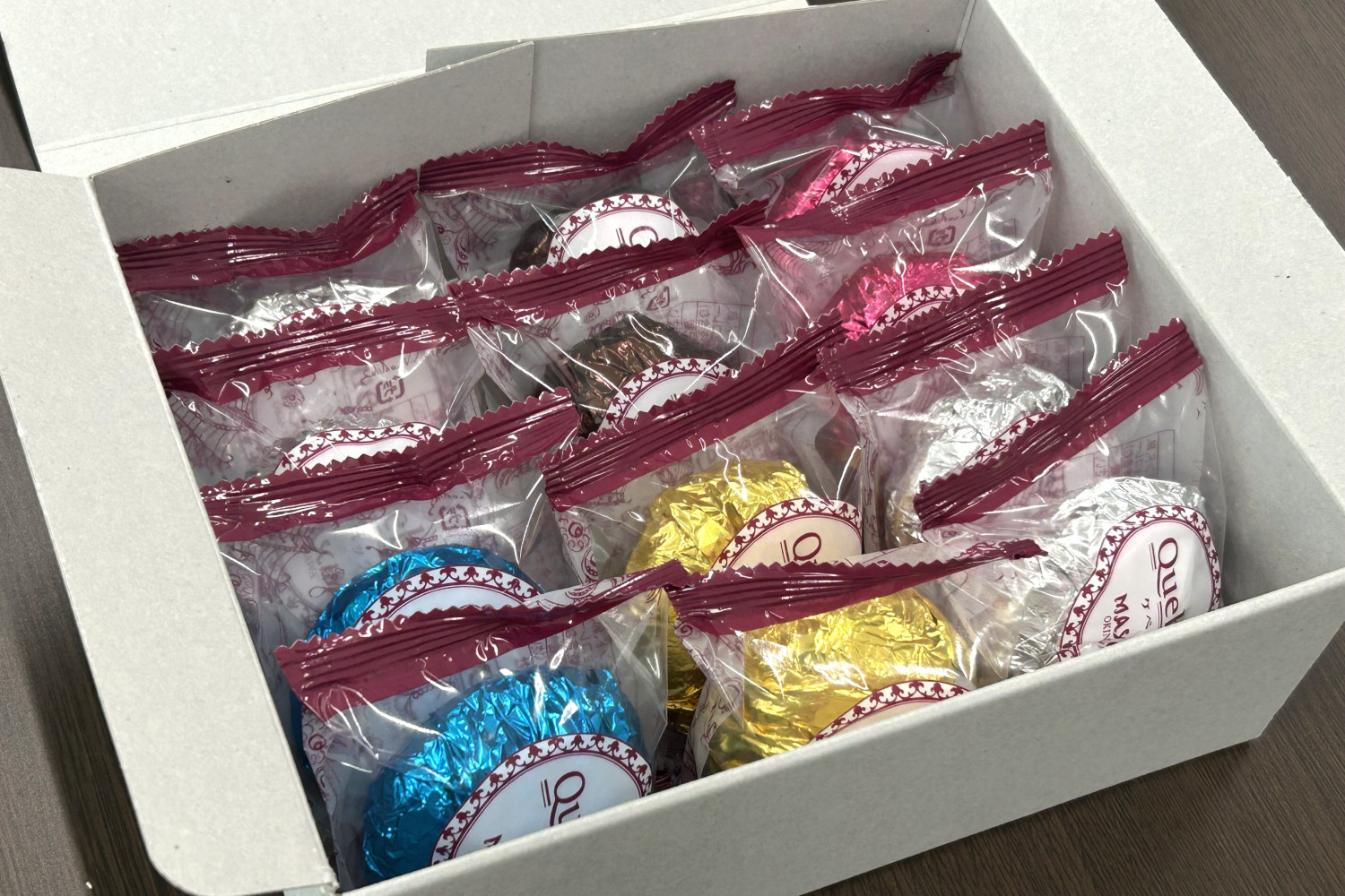 マキシムの定番商品の一つ「ケベック」は、ほろほろとやわらかな食感の焼き菓子。ひと口食べると上品な甘さとアーモンドの風味が広がります。カラフルな紙に包まれており、贈り物としてはもちろん、自分へのご褒美にもぴったりです。