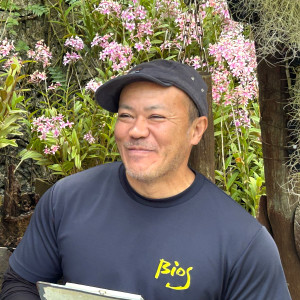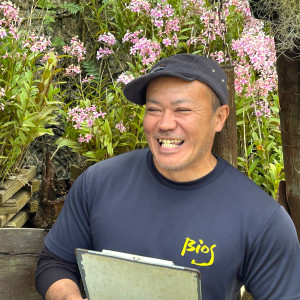 天願 聡さんは、スタッフとしてらんの栽培や体験プログラムを通して、訪れる人に自然の魅力を届けています。