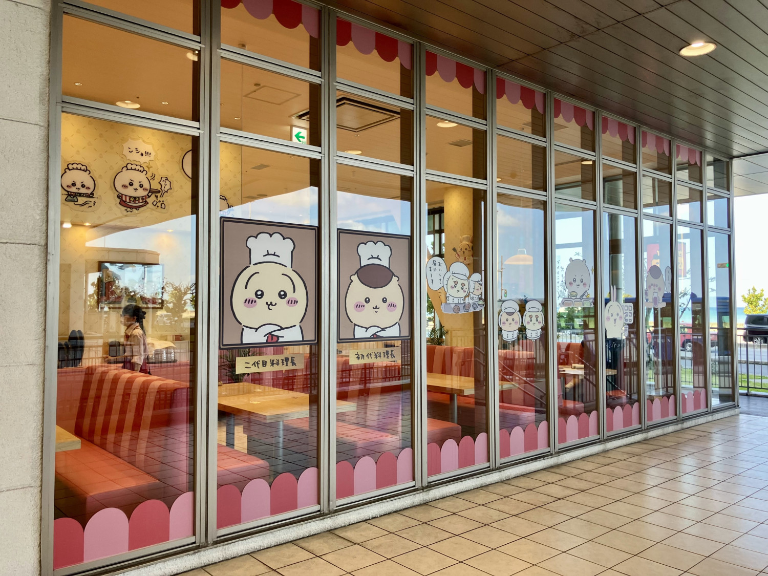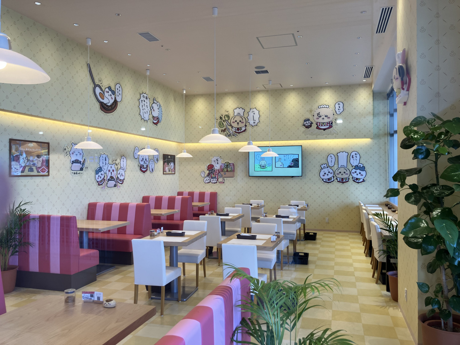 店内はどこか懐かしいファミリーレストラン風の空間に仕上げられ、ちいかわたちがお出迎えする可愛らしい演出が広がっています。
