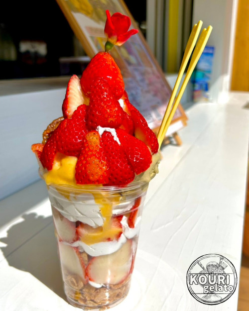 メニューは、季節ごとに変わるフレーバーや貴重なフルーツを使った数量限定ジェラートのほか、地域のいちご園から直接仕入れた「沖縄産イチゴもりもりパフェ」やシェイクもあります。