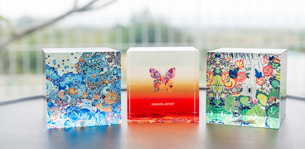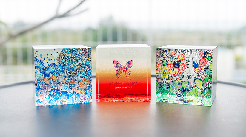 琉球王国時代から継承されてきた沖縄の伝統工芸である紅型(びんがた)。その若手作家の一人である新垣優香さんは、先人への感謝と尊敬の気持ちを大切にしながら「伝統を通して自分の世界を描きたい」と固定観念にとらわれない独自の感性と新しい技法でオリジナルの紅型デザインに取り組んでいます。特に、夕日やスポットライトに照らされてキラキラと輝くグリッターを使った作品が特徴的。新垣さんのお父様が経営する菓子店のパッケージをはじめ、多くの企業とのコラボで着物、アクリルキューブ、ストール、ボウタイに帆布バッグなど紅型デザインを取り入れたアイテムが商品化されています。