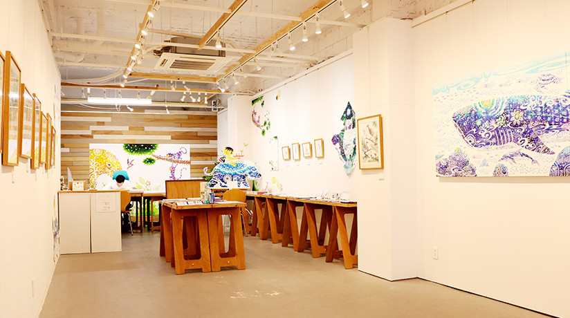 沖縄の「生命力の濃さ」に感動し、そこで感じた世界を独自のスタイルで琉球イラストレーションにて表現している与儀勝之さん。紅型、螺鈿細工などからインスピレーションを受けた作品を制作しており、『アートギャラリー・ソラノエ+アトリエ・ヨギマ』を構えています。ギャラリーにはアトリエが併設され、作品の展示販売が行われています。沖縄を描いた作品は、ポストカード、風呂敷、クリアファイル、スマホカバーなどになっているのでお土産やプレゼントにもおすすめです。