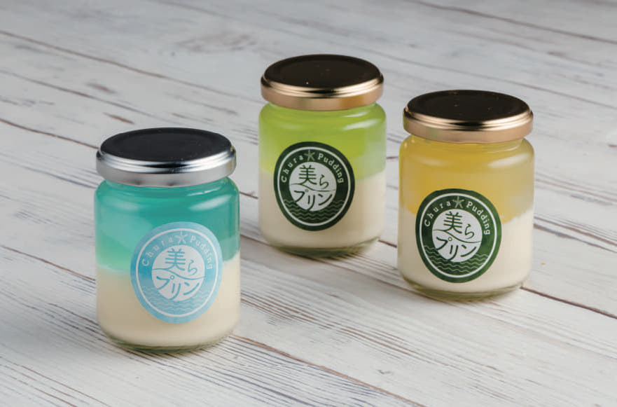 海洋深層水を使ったジュレ(ブルーハワイ・シークヮーサー・ライムの3種類)と塩カスタードプリンの組合せが人気のご当地プリン。ほどよい甘さとなめらかな口当たり、星型ナタデココ入りという遊び心も楽しめます。
