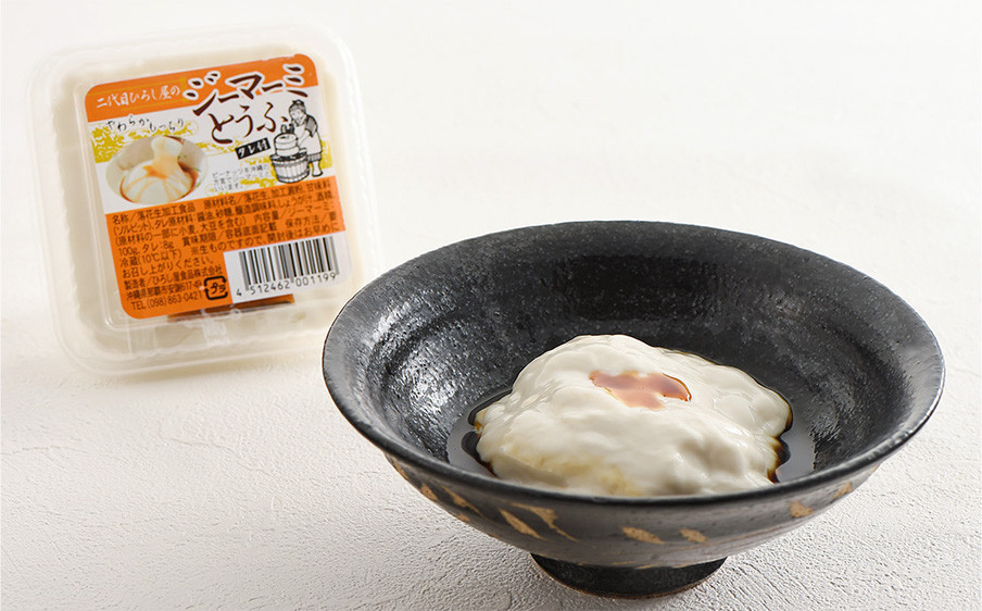 昭和48年創業、昔ながらの地釜炊き豆腐屋が作るジーマーミ豆腐です。県内で唯一、薄皮付き落花生を使っているので濃厚で風味豊かな味わいを楽しめます。ジーマーミ豆腐ならではのなめらかなもっちり感とオリジナルのタレとの組み合わせは絶妙で、ひとくち食べたらクセになること間違いないし。