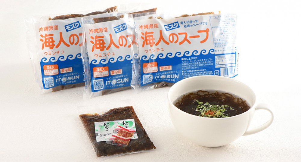 創業30周年の活もずく専門店が手がけた、もずくのおいしさを楽しめるスープです。1人前にパックされたもずくとスープ、薬味がセットになっていて、お湯を注ぐだけという手軽さと便利さも人気の理由です。2~3月に採れる、柔らかくて磯の香りいっぱいのもずくはスープにぴったりで、沖縄の海が育んだ素材の良さを堪能できます。