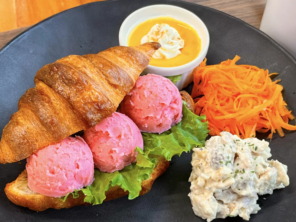 道の駅のお楽しみといえばやっぱり”食”なのではないでしょうか。併設されている「レストラン 美ら作」ではやんばる素材をはじめとする県産食材を使ったメニューが楽しめます。特に。ビーツを使ったビビッドなピンクが目を引くポテトをクロワッサンでサンドした”たっぷりポテトワッサンド”は思わず写真におさめたくなる可愛さ!添えられた蒸し鶏とお惣菜も一緒にサンドしながら、味変するのもおすすめですよ。そのほか、”沖縄県産・蒸し鶏プレート”や”沖縄県産・豚生姜焼きプレート”、”やんばるカレー”など、バラエティ豊かなメニューが勢ぞろいしています。ドリンクやスイーツも充実しているのですが、おやつとして特におすすめなのは”パイナップル スムージ&ケーキ”!どちらも地元産のパインを贅沢に使用していて、沖縄パインならではのさわやかな酸味が味わえます。やんばる式台湾パイナップルケーキも生地はサクほろな食感、中には濃厚なパイナップルあんが入っていて、ひとつ食べればもう一つ、と思ってしまうおいしさです。