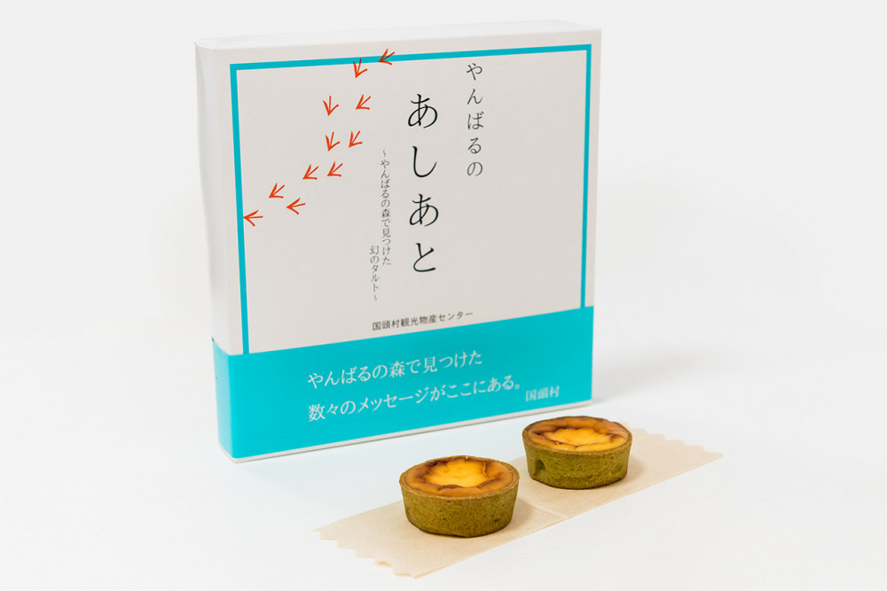 国頭の特産品であり、日本一茶摘みの早い緑茶として知られている「おくみどり茶」を使ったオリジナルスイーツ「やんばるのあしあと」は、濃厚なチーズと、おくみどり茶が練り込まれたタルト生地とが相まった香りと味わいが、国頭の自然を連想させるおいしさです。