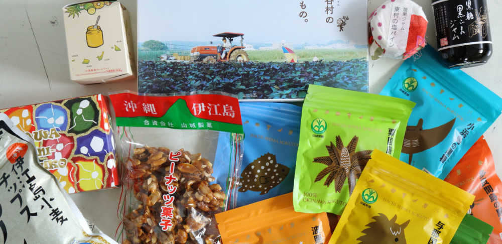 沖縄の自然や伝統芸能をモチーフにしたイラストに目がとまるのは「八島黒糖」。カラフルな袋の中身は、島のさとうきびから作られた個性的な黒糖です。道の駅、ファーマーズマーケット等で売られています。