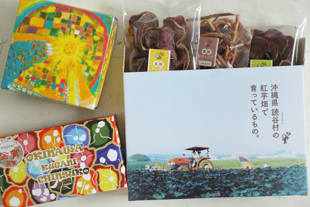 「紅芋チップス」は、化学肥料不使用で育てた紅芋を油で揚げて、シンプルに味付けた黒糖チップス、黒糖スティック、塩スティックの3種類。パッケージは箱全面が紅芋畑!とれたての紅芋を畑の中で食べているような気分になりそう。