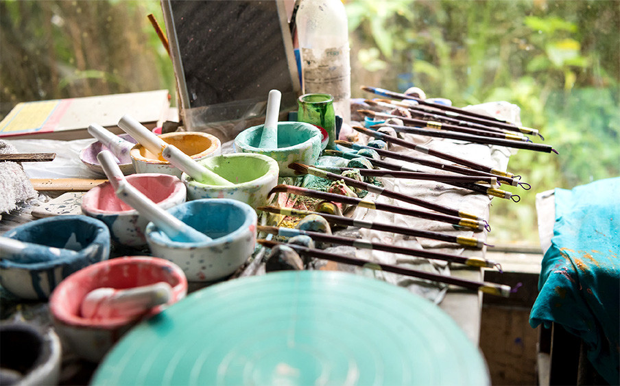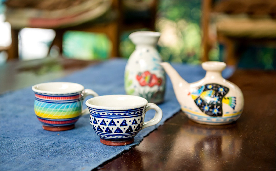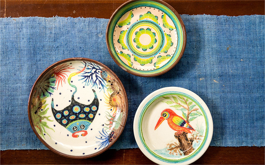島の生き物や植物などの絵柄と鮮やかな色彩が特徴の「南島焼」。島特有の赤土と工房裏の清流から粘度を作り、窯で焼き上げるまで3ヶ月もの時間を要するそう。湯飲みやプレート、ごはん茶碗が人気で、ギフト用として購入される方も多く、小さいサイズのごはん茶碗はお子さま用にもピッタリ。イベントや出張等で不在の場合もあるので、事前連絡をおすすめします。