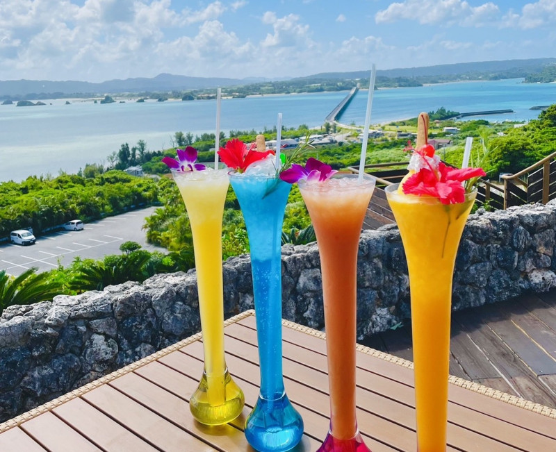 古宇利ブルーの絶景を目の前に島素材のグルメと彩豊かな名物である高さ45cmのタワードリンクを。