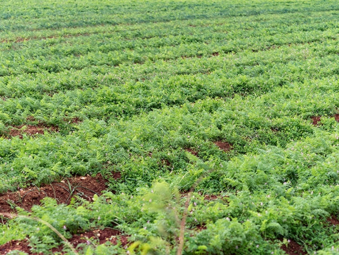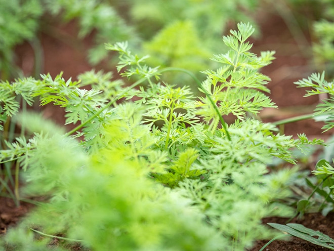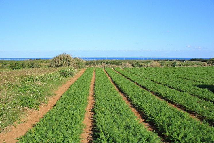 津堅島の大地を覆う「島尻マージ」と呼ばれる赤土の畑は、潮風に運ばれた海からのミネラルもたっぷりで、根菜類の栽培に適していると言われています。津堅島で栽培される「津堅にんじん」は通常の人参と比べて、糖度も栄養価も高い特別な人参として人気で、1月頃から5月にかけて収穫期を向かえます。島内の耕作地の大半を占めるにんじん畑が一面に広がる様子は津堅島ならではの風景です。