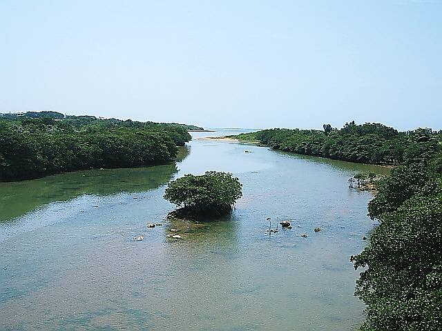 全長12kmの宮良川河口域約1500mに広がるマングローブ林です。マングローブ林は熱帯・亜熱帯の海岸や河口の、海水と川の水が混ざり合うところに発達します。沖縄ではおもにオヒルギ・メヒルギなどヒルギ科の植物が分布することからヒルギ林と呼んでおり、国の天然記念物に指定されています。干潮時にはタコの足のような気根や、その周辺にあらわれるカニやハゼなどを宮良橋から観察することができます。