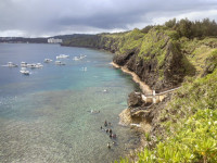 真栄田岬はコバルトブルーな西海岸に面し、青の洞窟、シュノーケリング及びスキューバーダイビングが楽しめる場所として有名です。又、多くのダイバーが熱帯魚の種類の多さとその人懐っこい動きに感動しきりです。全国的に有名な「青の洞窟」は神秘的な青の世界で皆様を魅了します。2月~4月には、北上する鯨を展望台から観察することが出来ます。去年は鯨と共に大海亀とイルカ数頭のジャンプを見ることが出来ました。