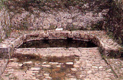 周辺の石積みは相方積みで、カーヌナー(井戸前広場)の石敷の表面がすり減り、角が丸くなっているのは、樋川を利用した人が踏み歩いたために摩擦で少しづつ減っていった跡になります。