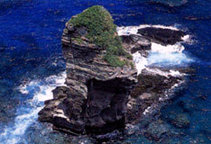 一般に島々の沖や港口にそそり立つ岩を立神と呼び、神聖な岩としてあがめられています。与那国島(よなぐにじま)の立神岩は、島の南東部にある景勝地、サンニヌ台の南の海中に垂直にそそり立っています。昔、ある若者が、海鳥の卵を採りに立神岩の頂上まで登り、下りることができなくなり、神に祈ったところ、無事サンニヌ台に戻ることができた、という伝説が残されています。サンニヌ台から歩いて5分の場所に立神岩展望台があります。