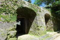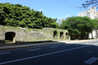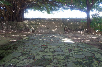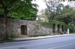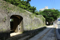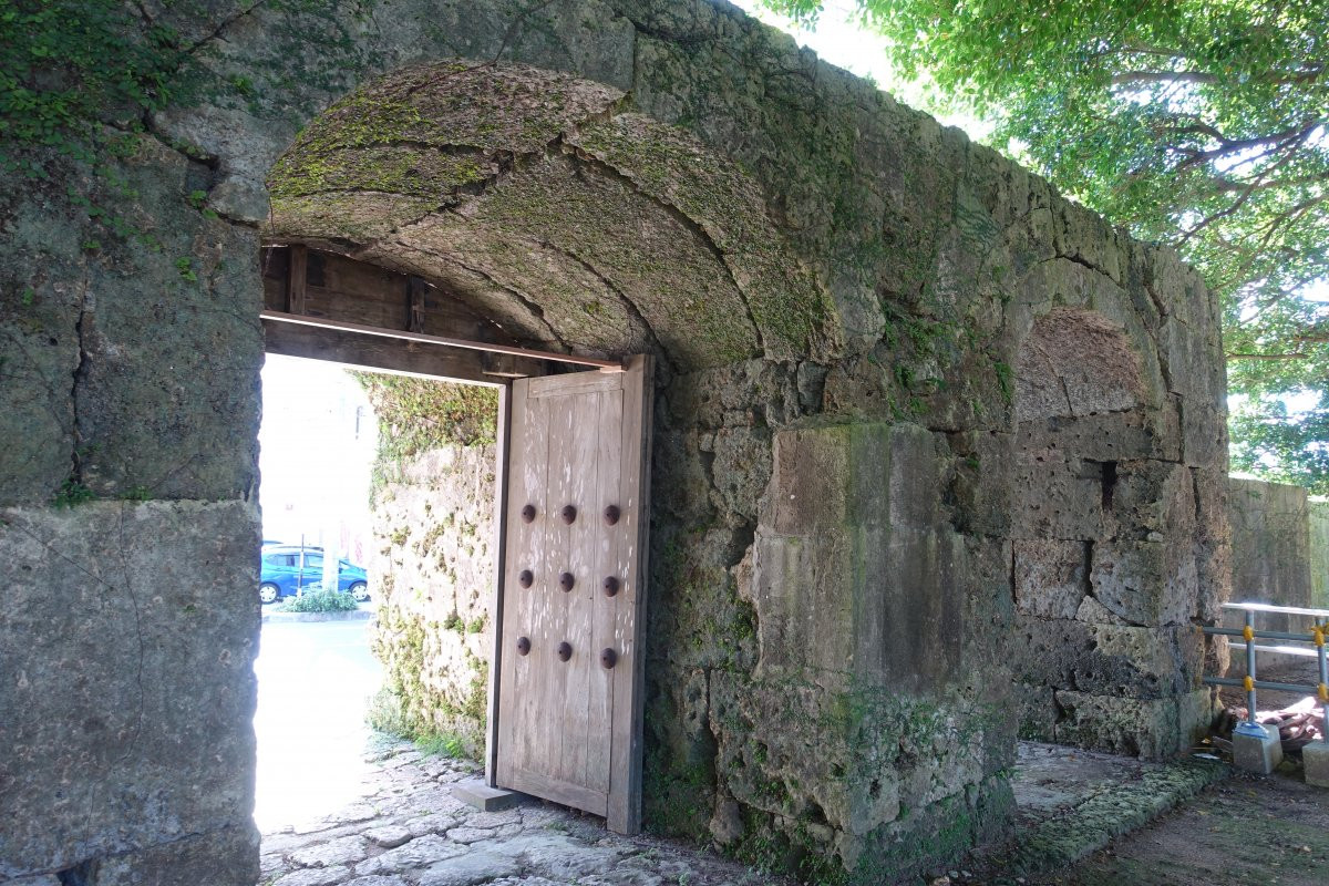 崇元寺第一門は境内に通じるアーチ型の石門で、南側道路に面し石垣の中央部にあります。石の積み方は切石の布積みで、左右にアーチ式の掖門(わきもん)を備えています。