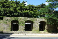 第一門及び石牆(せきしょう)とは、正面中央部の石造拱門(アーチ門)と周囲を巡る石垣をいい、門口には木製の扉が取り付けられています。