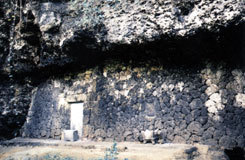 葬儀の際には、正面中央の石積みを取り外し御轎(おかご/肩にかつぐ輿)がそのまま入るように、幅1.7m、高さ2.4mの範囲の石垣に目地がついています。