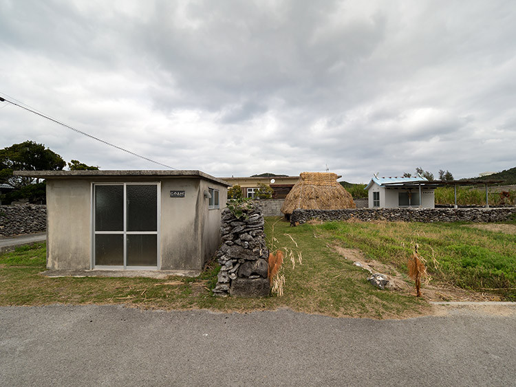 4本の石柱の上に、島内産の木材を使った小屋組みが乗り、屋根はススキで覆われた寄棟造りになっています。軒の高さは約60cmで壁はなく、内部は約5坪の土間になっています。