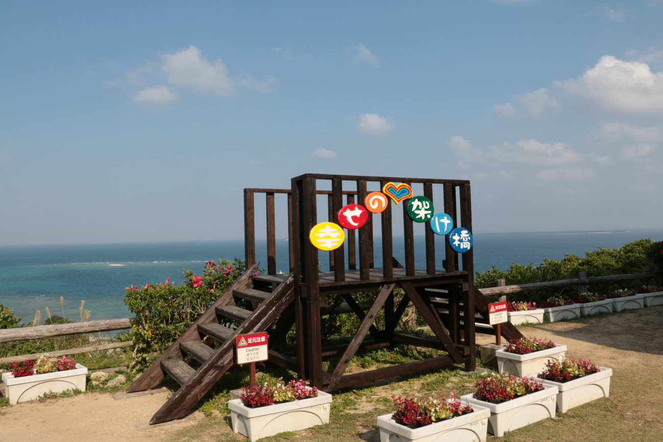 橋の上で両手を広げると世界遺産斎場御嶽と神の島久高島の中心になれるパワースポット。