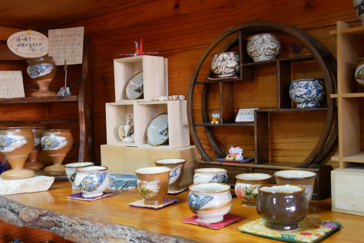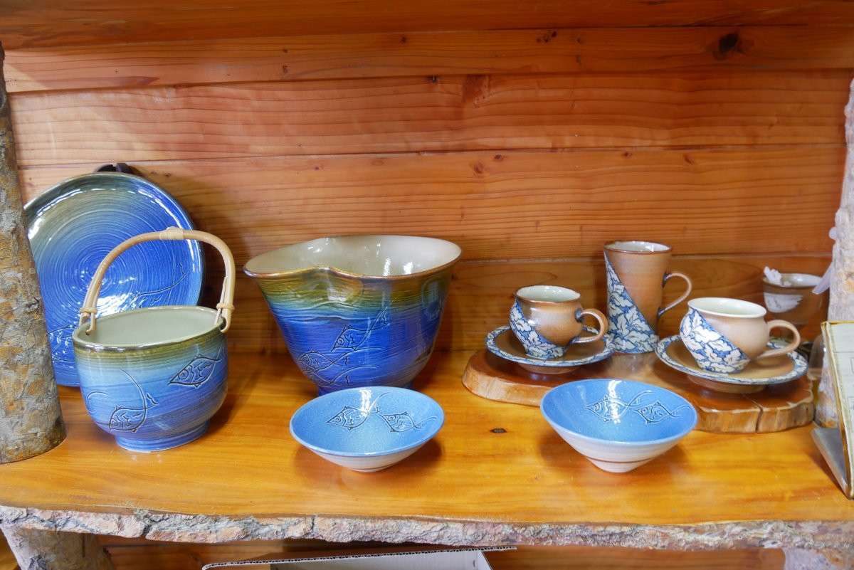 作品の特徴としては、沖縄の赤土の個性を生かした焼締花瓶や焼締のシーサーなどと、赤土に化粧掛けをし、亜熱帯地方特有の魚類、ハイビスカス、牡丹文などの線彫りを主体としています。また沖縄のシンボルであり魔除け、家内安全、福を呼ぶ縁起物として昔から門柱または屋根の上などに鎮座しているシーサーも手作りで制作しています。ぜひ一度ご来店ください。