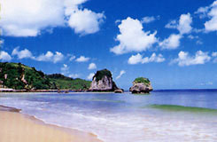 きめ細かい真っ白な砂浜が広がる三日月の形のビーチ。