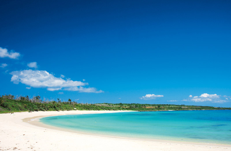 透明度と砂浜の美しさでは沖縄の中でも名高い伊良部島(いらぶじま)にある人気のビーチ。細かいさらさらの真っ白な砂浜が800m。ビーチからの眺めも抜群で、明るいコバルトブルーの海の上に、緑におおわれた下地島(しもじじま)、来間島(くりまじま)、宮古本島がキラキラまぶしく輝いているかのように一望できます。