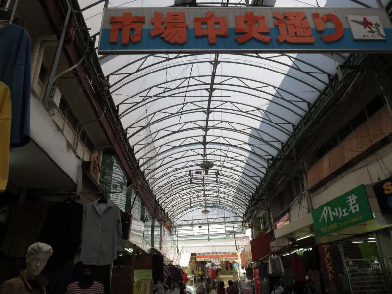 当店は国際通りから市場本通り牧志公設市場とファミリーマートを過ぎ、250m先の市場中央通りに位置しております。周辺にはセブンイレブンコンビニエンスストアや庶民的な小さな店舗が多く、洋服など格安で購入できます。