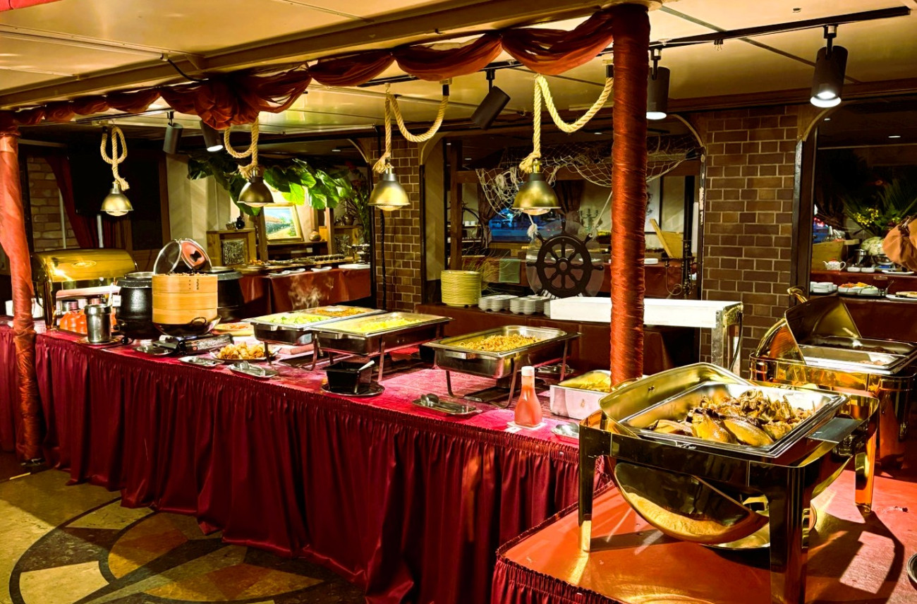 レストランシップ「モビーディック号」の2階レストラン会場では生演奏を聴きながら豊富なメニューを取り揃えたビュッフェコーナーからご自由にお食事をお召し上がり頂けます。又、開放感溢れる3階オープンデッキでは期間限定(4月~11月)でバーベキューも行っております。