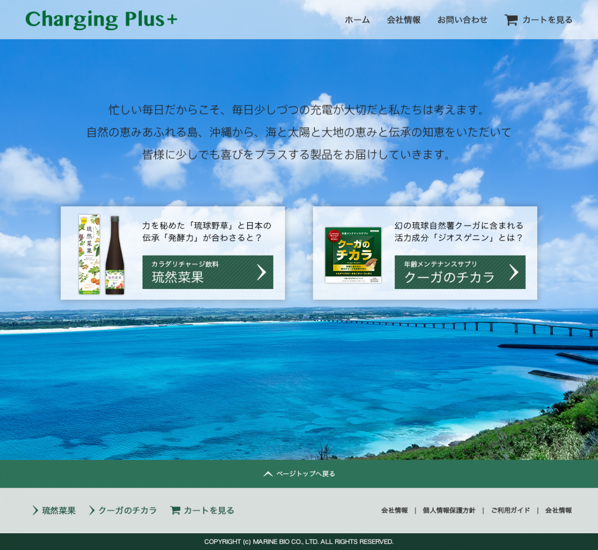 沖縄の自然とストーリー(伝承)をスパイスに、皆様の悩みに寄り添ったココロとカラダの健康をフル充電するための製品とその先にあるプラスの幸せをお届けしていく、マリーンバイオが提案する新しい通販するスタイルです。