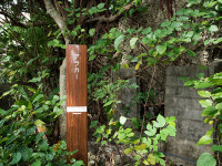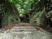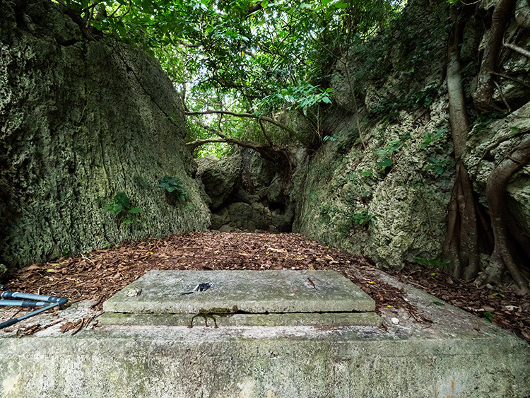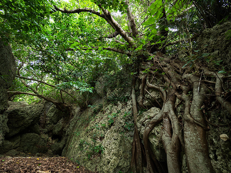 学校の裏側に行き、堀に沿って小道を歩くとアラカーに突き当たります。岩から湧き出す水を貯めているカー(井戸)です。岩にはたくましい樹木の根が張り付いていて、生命力を感じる神聖な場所です。ここの水を汲んで産水として使ったり、死者を清める水として使ったりしていたと言われています。