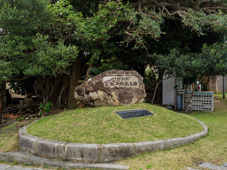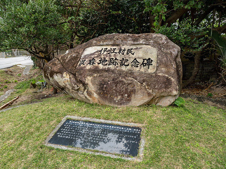 第二次世界大戦末期に伊江島を占領した米軍が、当時の伊江島島民を捕虜として慶良間の島々に強制的に収容、慶留間島にも多くの伊江島島民が収容されていました。この石碑は、戦後50年の節目を迎えるにあたって、伊江島の人々がかつて収容所があった場所に建立した記念碑です。「この地は、耐え難い日々を共に生きてきた苦難の歴史の地である。戦後50周年を記念し、この碑を建立する。平成7年12月6日 沖縄県伊江村」と刻まれています。