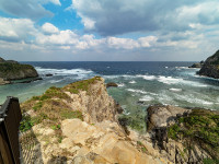 断崖に立つ展望台から周辺の島々を望む
