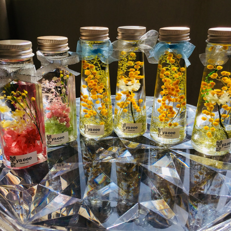 ハーバリウムとはガラスボトルの中に花材やフルーツを詰め、専用のオイルを入れて飾る新しいインテリアです。