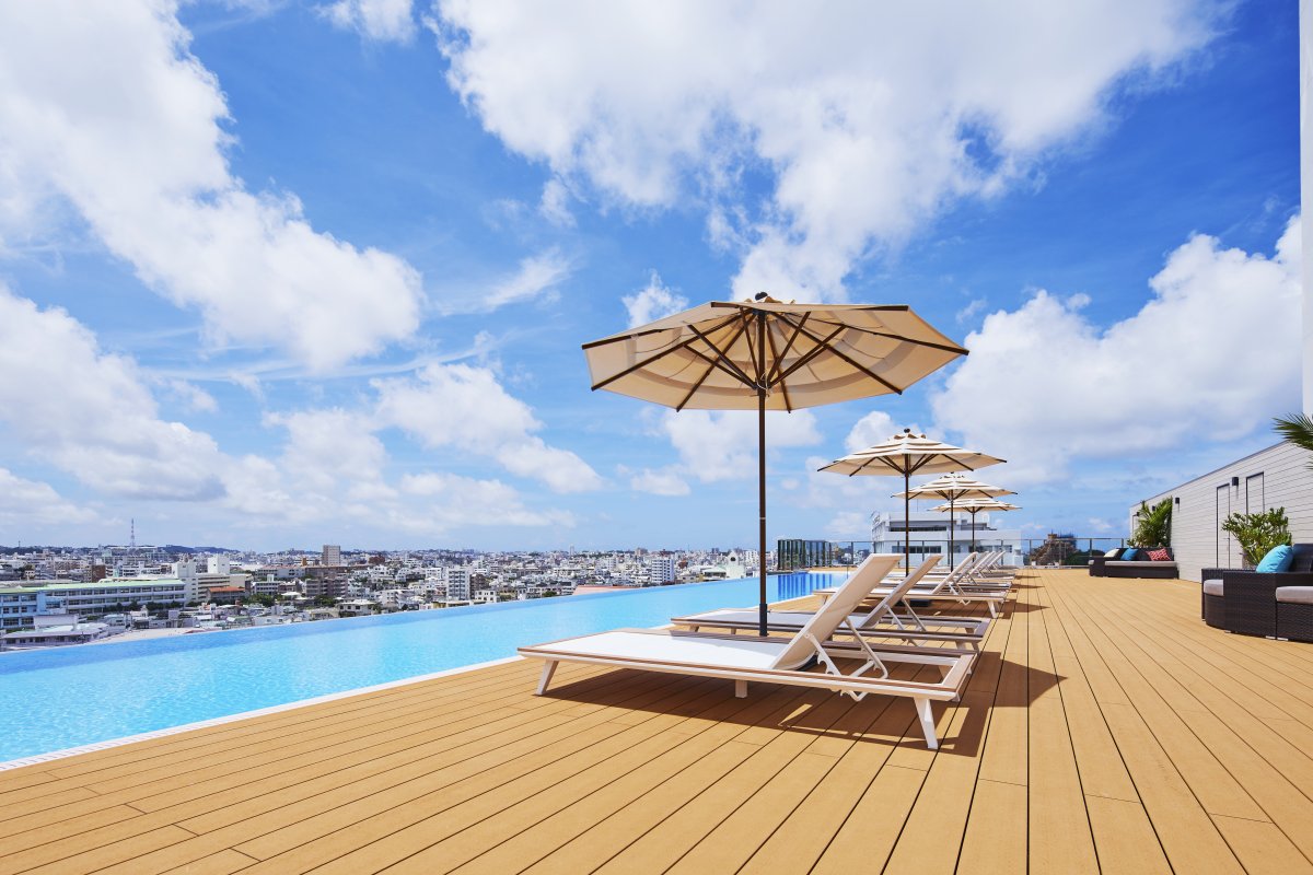 国際通りから車で約5分、那覇にいてもリゾート気分を。那覇市内唯一のインフィニティプールがあるホテルです。夜も楽しめるインフィニティプールはホテルの自慢で高台から那覇市街の景色を望み、キッズプールもあるのでファミリー、お子様連れでのご利用もおすすめ。隣接するバーベキューテラスも人気。国際通りも徒歩圏内、観光のアクセスポイントとして便利な立地です。