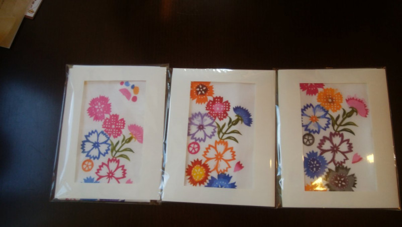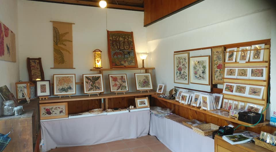 紅型、芭蕉布や芭蕉紙に染めたタペストリー、ハガキ、しおりを展示販売しています。