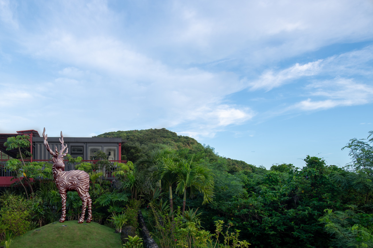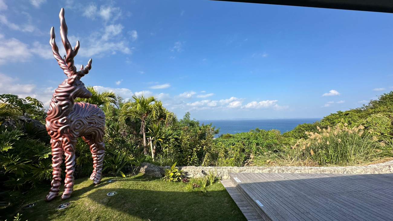 南城美術館は、沖縄で最も神聖な場所とされる世界遺産「斎場御嶽」と同じ山中に位置し、その背後には静寂に包まれた森が広がり、目の前には青い海と空を一望できる絶景が広がります。