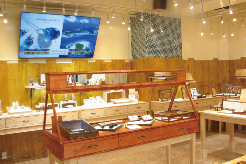 県産品認定工房「ガラス工房長七屋」の直営店。地域によって異なる沖縄の海を再現したオリジナルホタルガラス“七海シリーズ”など